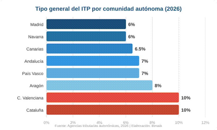 El siguiente gráfico muestra el tipo general del ITP en las principales comunidades autónomas. La diferencia entre comprar en Madrid (6 %) y en Cataluña (10 %) supone, para una vivienda de 250.000 euros, nada menos que 10.000 euros de diferencia solo en impuestos.