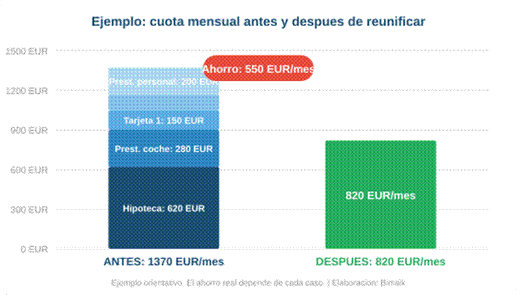 - Cuota mensual mucho más baja. El ahorro típico oscila entre el 40 % y el 70 % del total de cuotas mensuales. En casos reales, familias que pagaban 1.370 euros al mes en distintas cuotas pasan a pagar unos 820 euros con una sola cuota reunificada.